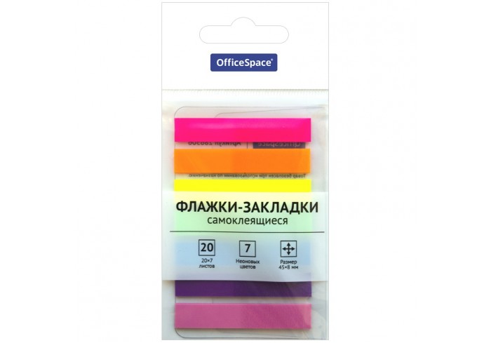 Самоклеящиеся пластиковые флажки-закладки прямоугольной формы 45 х 8 мм. 7 ярких неоновых цветов по 20 закладок. Упакованы в пакет с европодвесом...