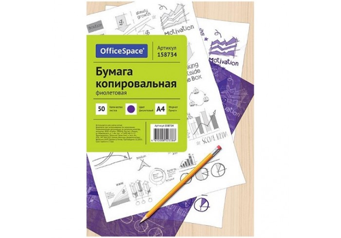 Имеет стандартный формат А4 и односторонний красящий слой фиолетового цвета. Не пачкается. Может использоваться многократно. Копировальная бумага упак..