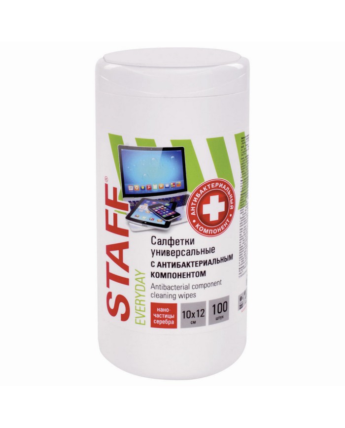 Чистящие влажные салфетки STAFF с антибактериальным компонентом предназначены для очистки и дезинфекции (обеззараживания), удаления пыли и загрязнений с бытовой и офисной техники. Не оставляют разводов на поверхности.Они имеют размер 100х120 мм и выполнены из нетканого материла на целлюлозной основе плотностью 25 г/м2. Упакованы в пластиковую тубу по 100 штук.Пропитывающий состав: вода - более 30%, неионогенные ПАВ менее 5%, наночастицы серебра Ар-Бион-2 (антибактериальный компонент) - менее 5%, консервант - менее 5%, антистатический компонент - менее 5%, отдушка - менее 5%.Перед применением слегка проветрить, чтобы салфетка не была слишком влажной. Также необходимо ознакомиться с инструкцией производителя устройства, которое подвергается очистке.