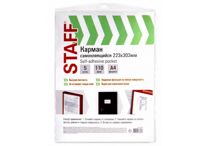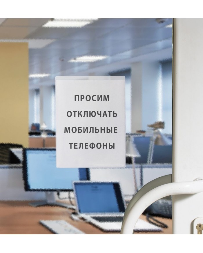 Предварительно снимите защитную бумажную поверхность, наклейте карман на гладкую поверхность, вложите листок с информацией...