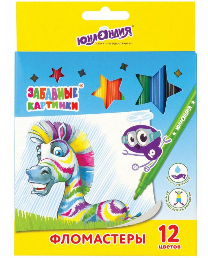 Фломастеры ЮНЛАНДИЯ 12 цветов, "ЗАБАВНЫЕ КАРТИНКИ", вентилируемый колпачок, картон,