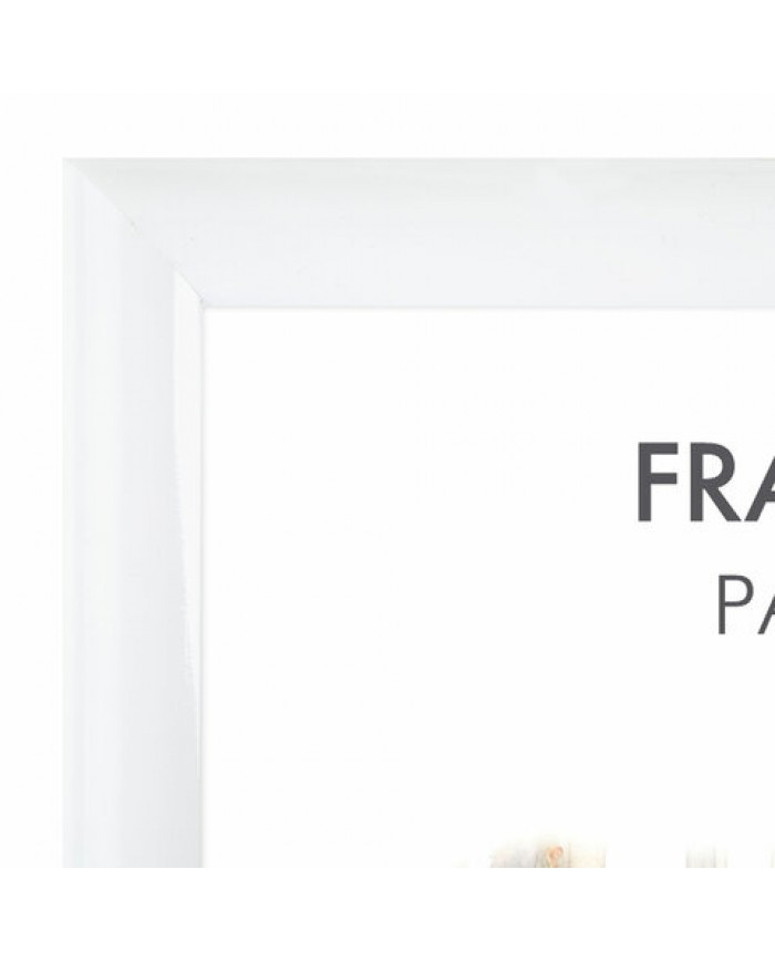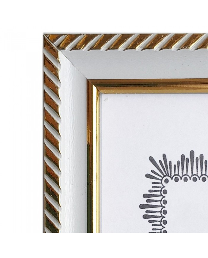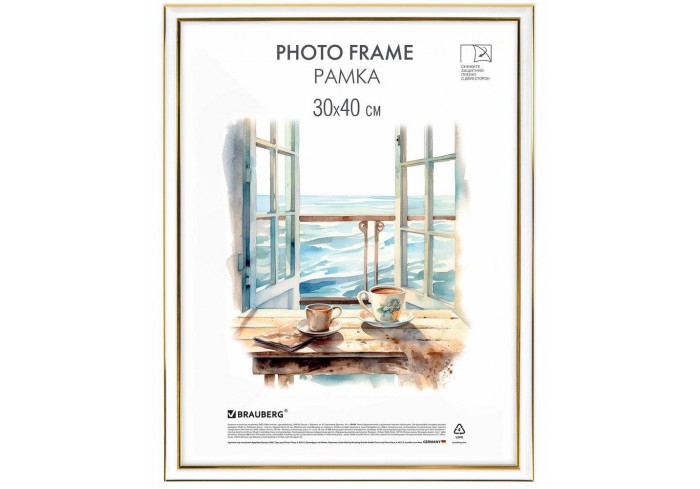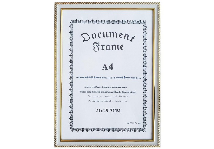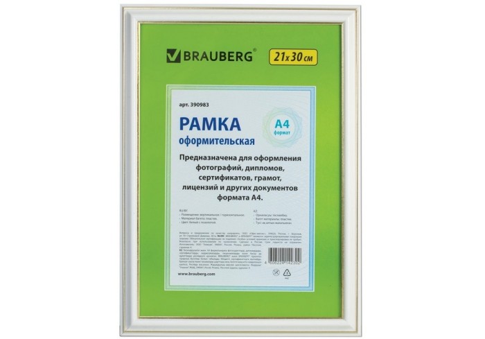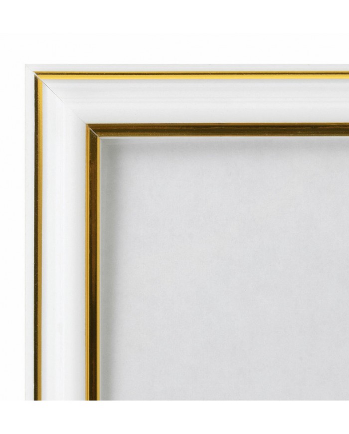 Рамка крупного формата А3 (30х40 см) выполнена из пластика в белом цвете с изюминкой в виде двойных золотистых линий, за счет чего отлично впишется ка..
