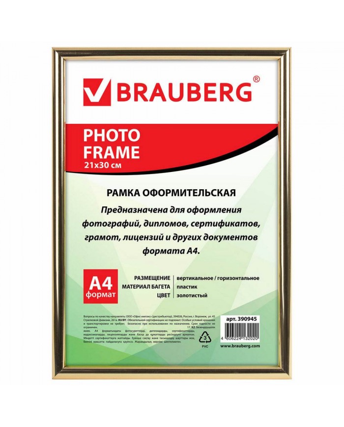 Рамка 21х30 см, пластик, багет 12 мм, BRAUBERG "HIT2", золото, стекло