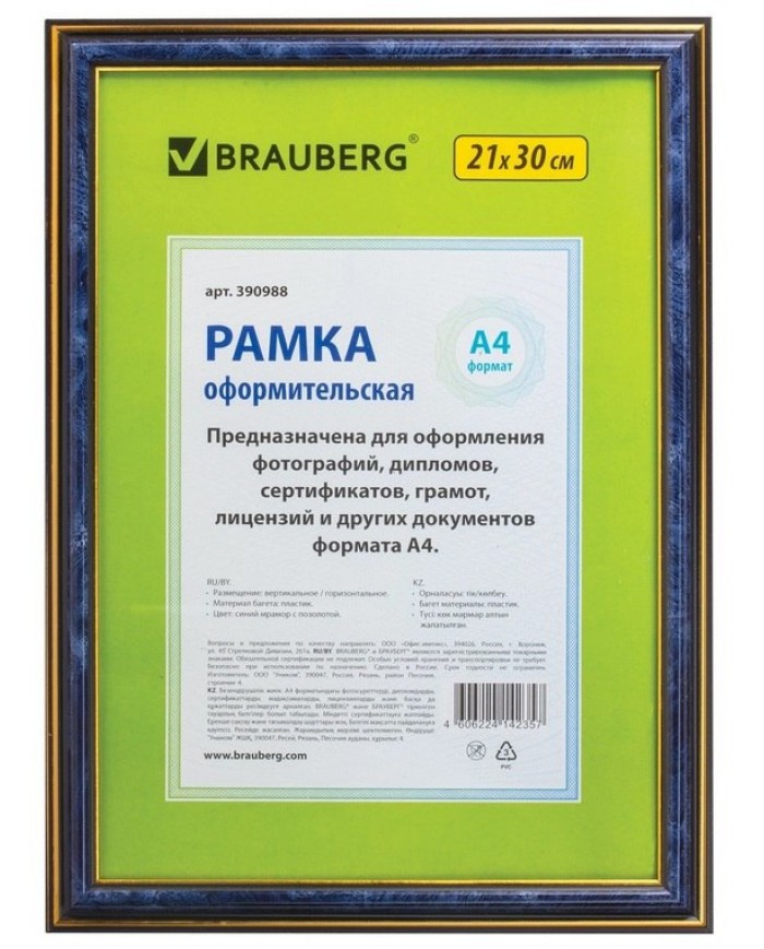 Выполнена из пластика цвета "синий мрамор" с двойной позолотой, за счет чего отлично впишется в домашний и деловой интерьер. Имеется возможность вертикального и горизонтального подвеса. Ширина багета - 20 мм. Аккуратный вид достигается благодаря стеклянной вставке. Микрогофрокартон обеспечивает плотное прилегание и отсутствие в будущем деформации содержимого в рамке. Термоусадочная пленка гарантирует сохранность рамки при транспортировке, отсутствие сколов и потертостей.