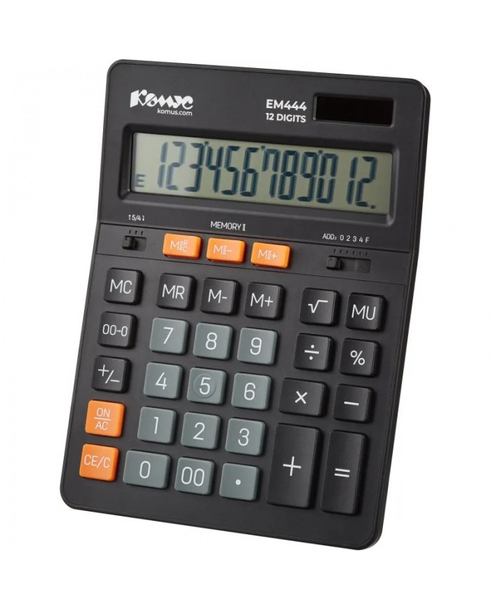 Калькулятор настольный ПОЛНОРАЗМЕРНЫЙ КОМУС EM444, 12-разряд, двойное питание, 204x155мм, черный