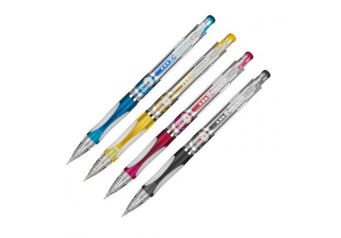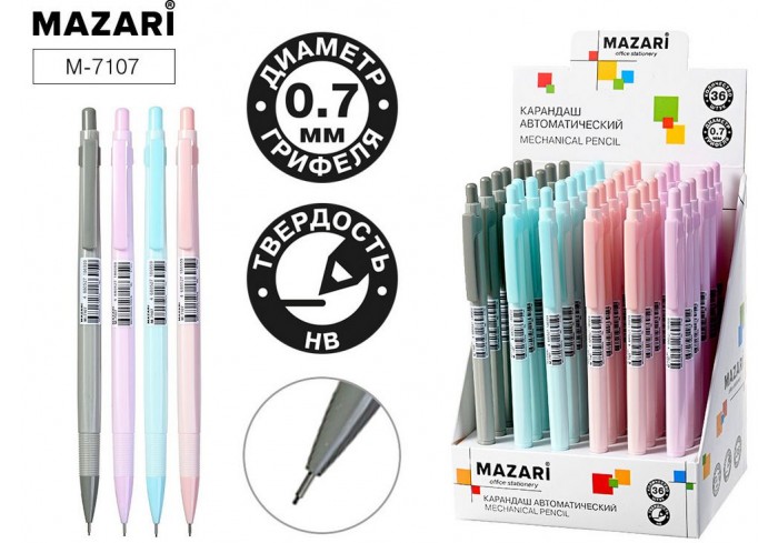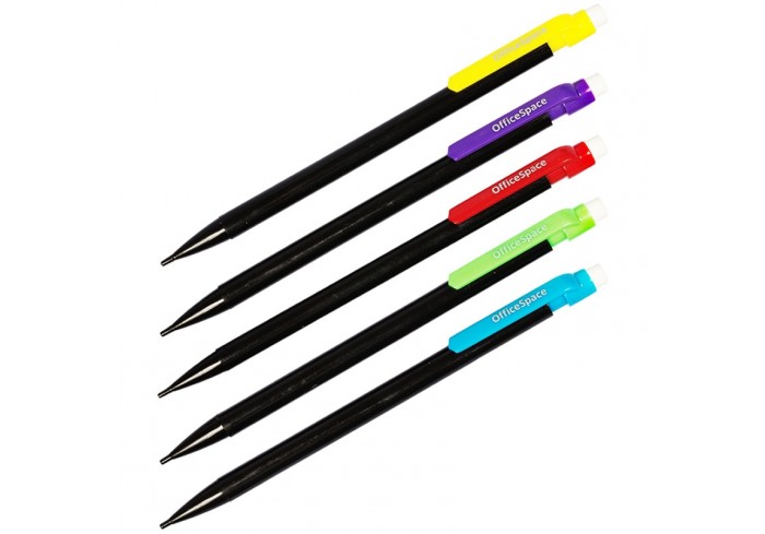 Карандаш механический с ластиком, толщина линии - 0,5 мм. Упакованы в коробку по 24 штуки, 5 ярких цветов корпуса ассорти. Форма корпуса круглая. Гриф..