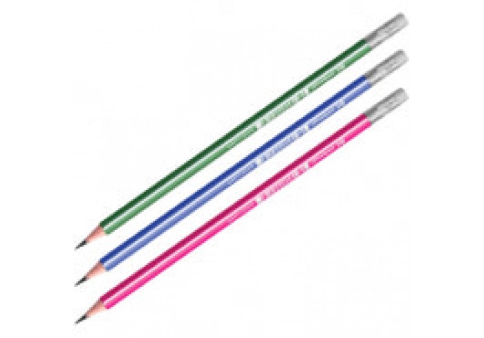 Пластиковый чернографитный карандаш с ластиком. Полосатый корпус ассорти (зеленый, синий, красный). Твердость HB. Заточенный...