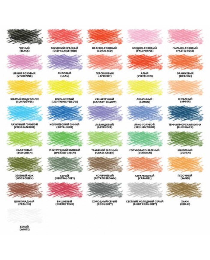 Набор состоит из 36 цветов: темно-синий, синий, фиолетовый, сиреневый, пурпурный, коралловый, розовый, бежевый, бледно-розовый, бордовый, красный, алы..