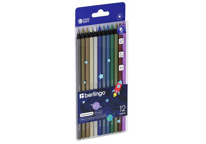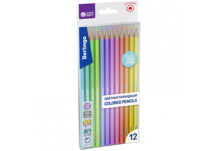 "SuperSoft" - линейка качественно новых цветных карандашей Berlingo. Набор цветных карандашей 12 нежных пастельных цветов. Шестигранная форма. Грифель..