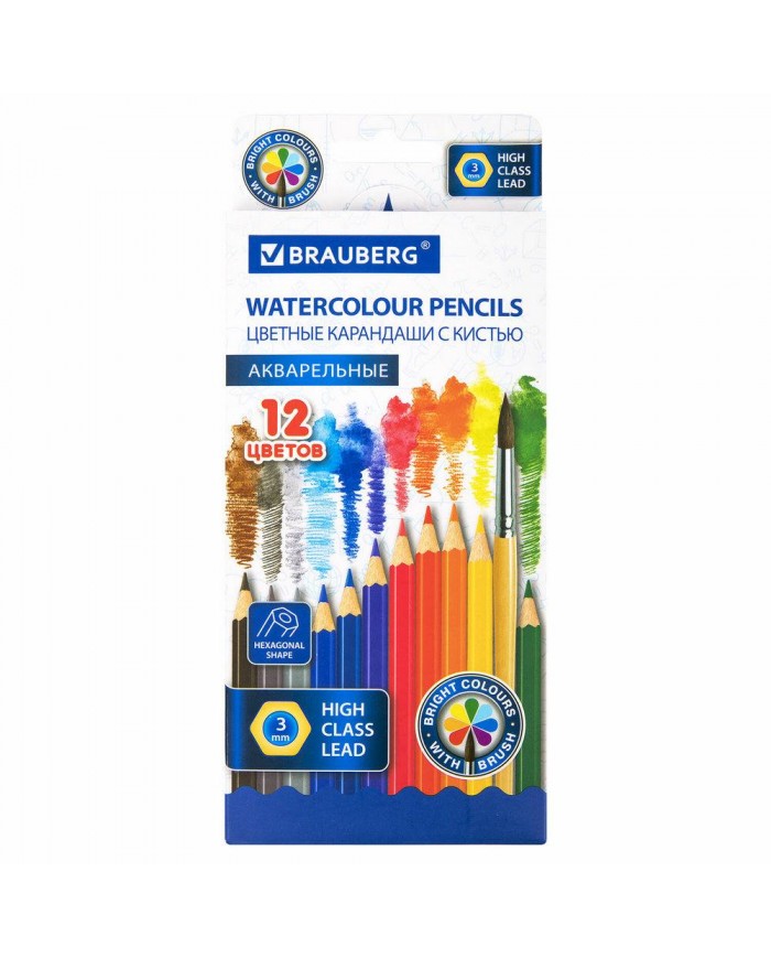 Карандаши цветные акварельные классические мягкие BRAUBERG, 12 цветов, с КИСТЬЮ, 181848