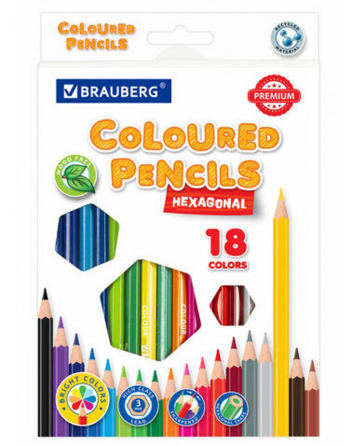 Карандаши цветные BRAUBERG PREMIUM, 18 цветов, шестигранные, грифель 3 мм,