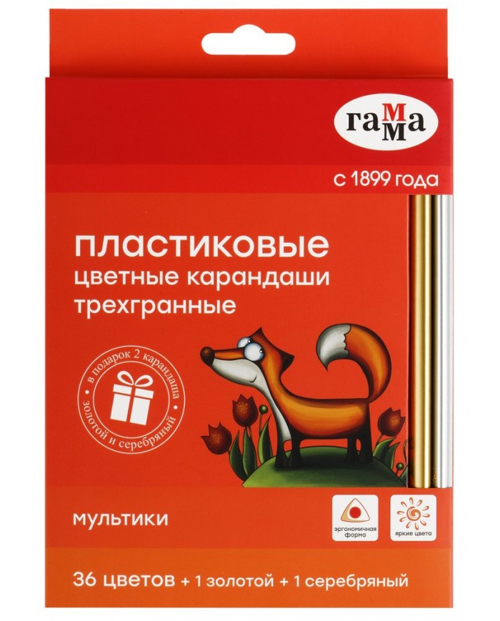 Цветные пластиковые карандаши ГАММА серии «Мультики» выполнены в эргономичном трёхгранном корпусе, который подскажет ребенку, как правильно держать карандаш во время творческих занятий. В наборе 36 цветов. Также в подарок идёт 2 карандаша: серебряный и золотой. Проклеенный ударопрочный грифель диаметром 3 мм не крошится во время заточки и не ломается даже после падения. Корпус карандаша длиной 174 мм изготовлен из высококачественного пластика. За яркость и высокую укрывистость отвечают качественные пигменты в составе. Ребенку не придется сильно давить на карандаш – рисунок получится ярким и равномерно закрашенным. Упаковка – картонная коробка с европодвесом.