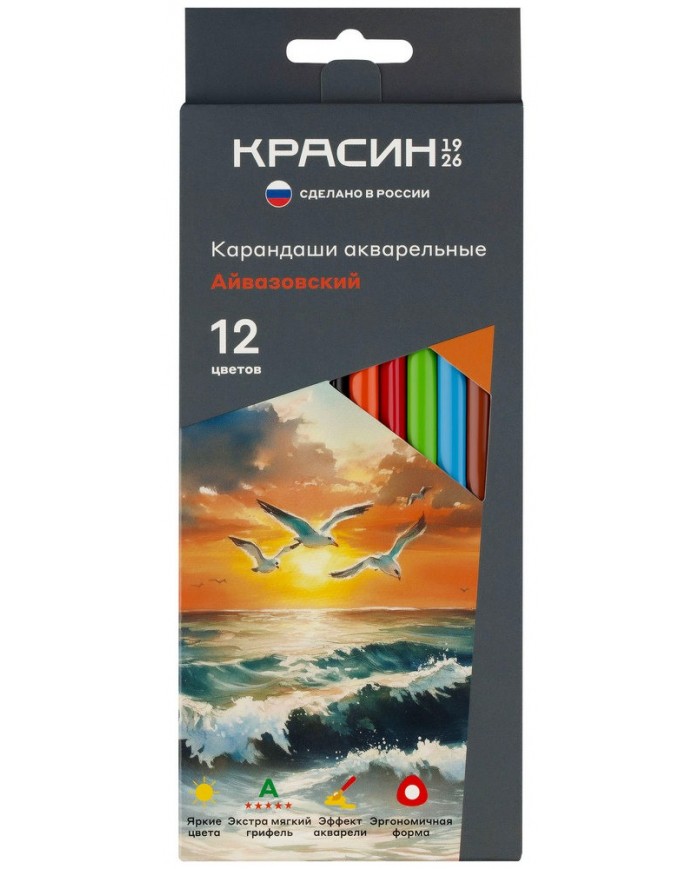 Акварельные карандаши «Красин» серии «Айвазовский» – отличный инструмент для развития творческих способностей и фантазии детей и взрослых. Они позволяют достичь эффекта акварельных красок в работе. В наборе 12 цветов: красный, синий, жёлтый, зелёный, чёрный, коричневый, голубой, фиолетовый, оранжевый, салатовый, светло-коричневый, розовый.