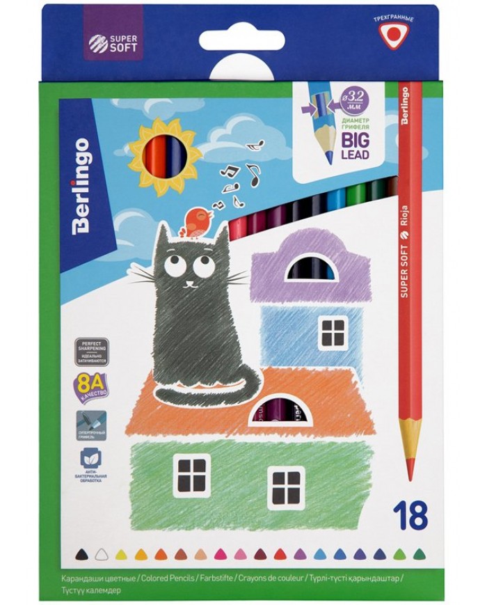 "SuperSoft" - линейка качественно новых цветных карандашей Berlingo. 18 цветов. Эргономичная трехгранная форма. Указание цвета на каждом карандаше на английском языке. Поле для подписи имени владельца на каждом карандаше. Упаковка в плотную матовую картонную коробку со склеенным европодвесом. Пластиковый трей внутри предотвращает скатывание карандашей и позволяет легко собирать их в коробку. Грифели высочайшего стандарта качества 8А, являющегося максимальным для нехудожественных цветных карандашей. Мягкость письма, сравнимая с рисованием маслом и пастелью. Яркие насыщенные цвета, обладающие превосходной смешиваемостью. Увеличенная до 3,2 мм толщина грифеля для безупречно комфортного раскрашивания. Уникальная формула и технология производства грифелей, в результате которой достигается одновременно удивительная мягкость письма и прочность, позволяющая грифелю выдерживать даже сильное нажатие под углом 45 градусов. Специальная проклейка, предотвращающая поломку грифеля внутри карандаша при падении. Стойкость к повреждениям. Корпус из древесины высшего качества, прошедшей тщательную обработку. Материал, сохраняющий свою прочность и легко поддающийся ровной заточке без усилий. Уникальная антибактериальная обработка на специализированном оборудовании, гарантирующая безопасное использование продукции детьми.