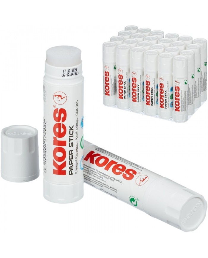 Клей-карандаш Kores Paper Stick специально разработан для склеивания материалов из бумаги. Прочно склеивает за 60 секунд. Не содержит растворителей и кислот, не токсичен. Мягко скользит по бумаге благодаря содержанию глицерина. Герметичная упаковка обеспечивает длительный срок службы. Легко смывается и отстирывается водой. Не содержит цветовых пигментов(бесцветный). Характерной особенностью является возможное выделение глицериновых капель на поверхности данного клея, что придает легкость скольжения и возможность легкого нанесения клея на бумагу,  тем самым обеспечивая  экономичное расходование клея.