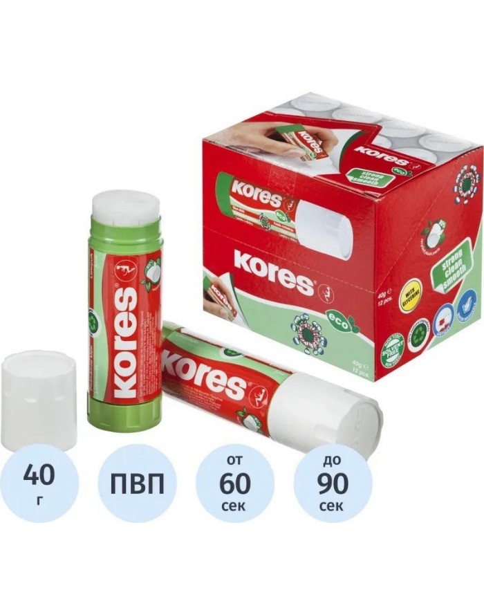 Клей-карандаш Kores Glue-Eco предназначен для склеивания бумаги, картона и фотобумаги. Основа клея обладает мягкой структурой и содержит глицерин для легкого скольжения. С помощью клея-карандаша можно зафиксировать текстиль на бумаге. Ткань к ткани лучше не прикреплять, так как клей смывается и отстирывается водой. Не имеет запаха. Простой и удобный механизм, расположенный в основании стержня, позволяет легко выкрутить и закрутить столбик клея. Вес - 40 г. Форма корпуса: круглая. Не содержит цветовых пигментов (бесцветный). Безопасен для детей. Характерной особенностью является возможное выделение глицериновых капель на поверхности данного клея, что придает легкость скольжения и возможность легкого нанесения клея на бумагу, тем самым обеспечивая экономичное расходование клея. Клей-карандаш на 75% состоит из вторичного сырья (переработанный пластик, бумага). Имеет высокий показатель прочности склейки.