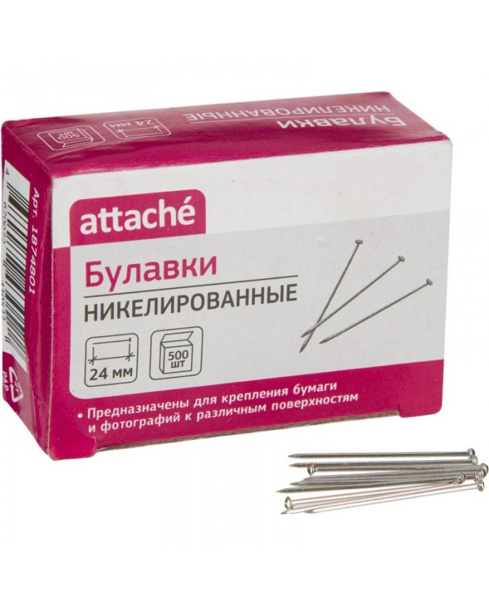 Металлические булавки Attache универсальные используются для различных целей, как для прикрепления бумаги на пробковые доски, так и при шитье либо в иных целях. Изготовлены и качественной металла с никелированным покрытием. В картонной упаковке 500 булавок. Длина булавки: 24 мм. Цвет: серебряный (металлический).