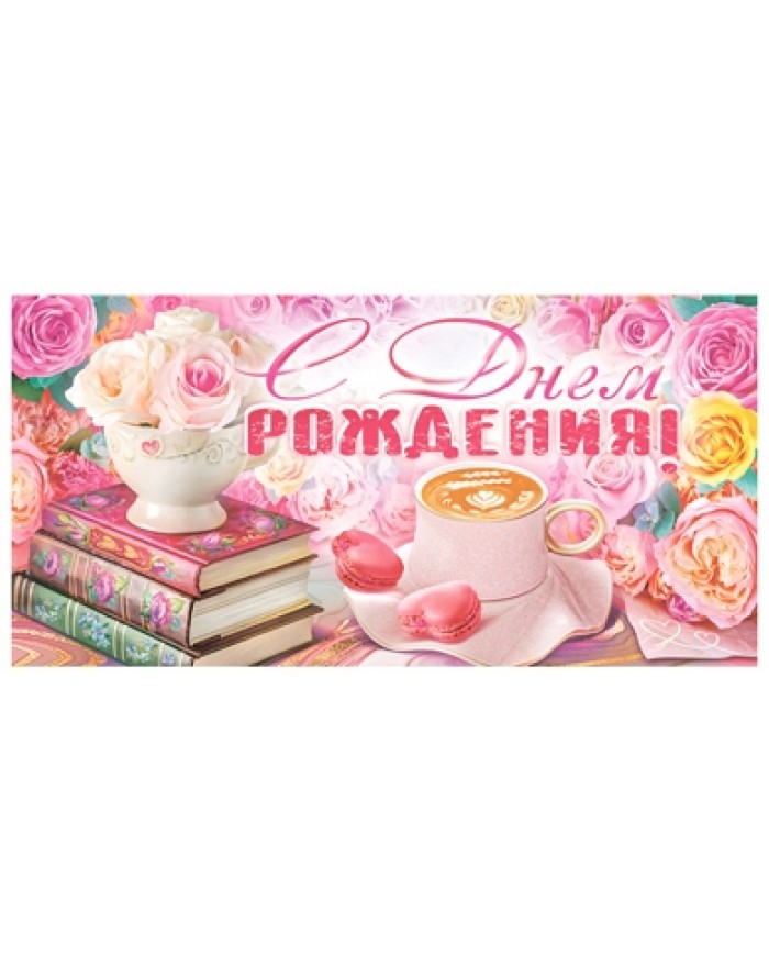 Конверт для денег Горчаков ГК "С ДНЕМ РОЖДЕНИЯ!" (цветы, чашка на блюдце с печеньем, ваза на книгах)