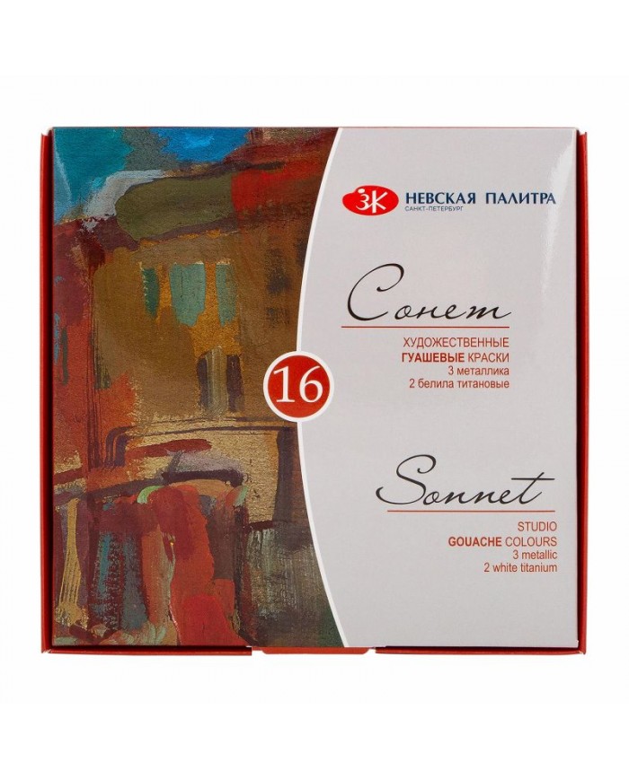 Гуашь художественная ?Сонет? 16 цветов по 20 мл. Краски изготовлены по новой технологии с применением пигментных паст и синтетического связующего. После высыхания приобретают бархатистую матовую поверхность. Обладают высокой укрывистостью. Сбалансированная палитра из 16 цветов в наборе гуашевых красок ?Сонет? позволяет решить множество творческих задач начинающего художника при выполнении учебных работ, этюдов и эскизов. Баночки упакованы в фирменную картонную коробку. Температура транспортирования/хранения: не ниже 0 °С. Состав набора: белила титановые, белила титановые, желтая, охра светлая, красная, английская красная, фиолетовая, сине-зеленая, синяя, изумрудно-зеленая, зеленая темная, коричневая, черная, светлое серебро, золото инков, бронза. Размер упаковки: 17.5х17.5х3.5 см