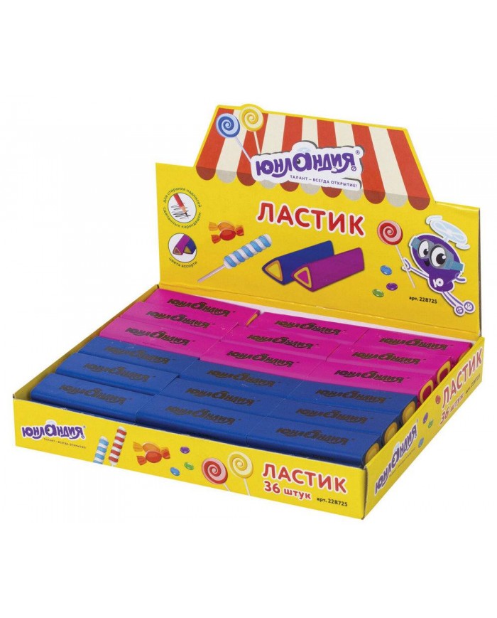 Ластик выполнен из мягкой термопластичной резины. Каждый ластик имеет штрихкод. Упаковка в дисплей. 6 цветов ассорти...