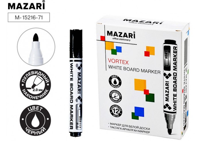 Маркер для доски черного цвета обладает круглым пластиковым корпусом диаметром 17 мм. Наконечник круглой формы обеспечивает толщину линии письма 2-5 м..