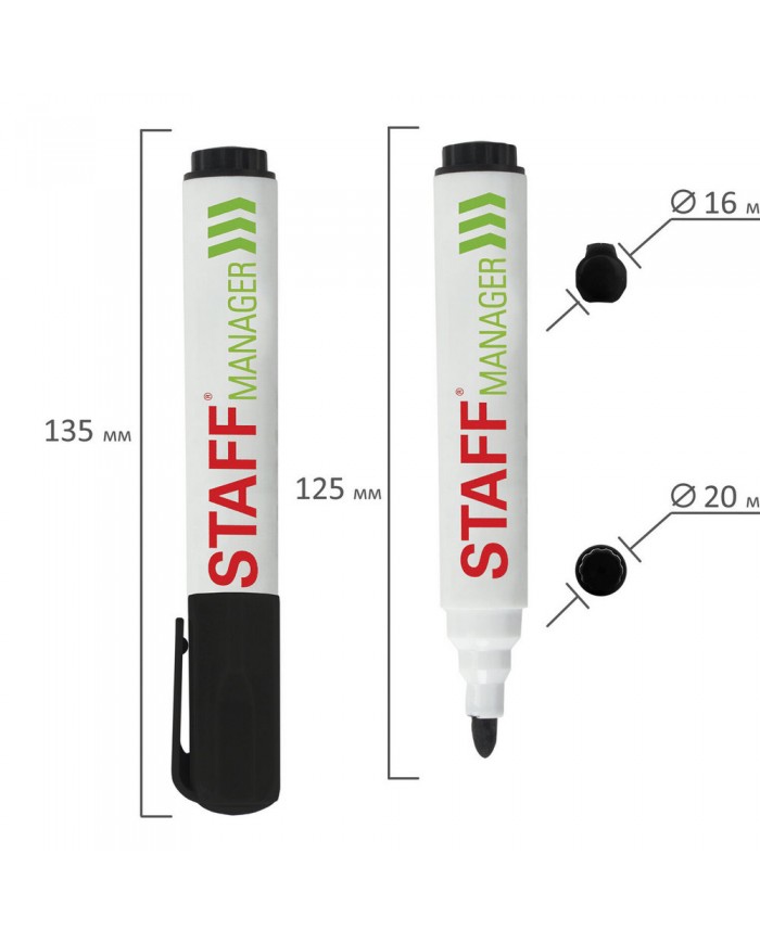Маркер для доски черного цвета обладает круглым пластиковым корпусом диаметром 20 мм. Наконечник круглой формы обеспечивает толщину линии письма 5 мм,..
