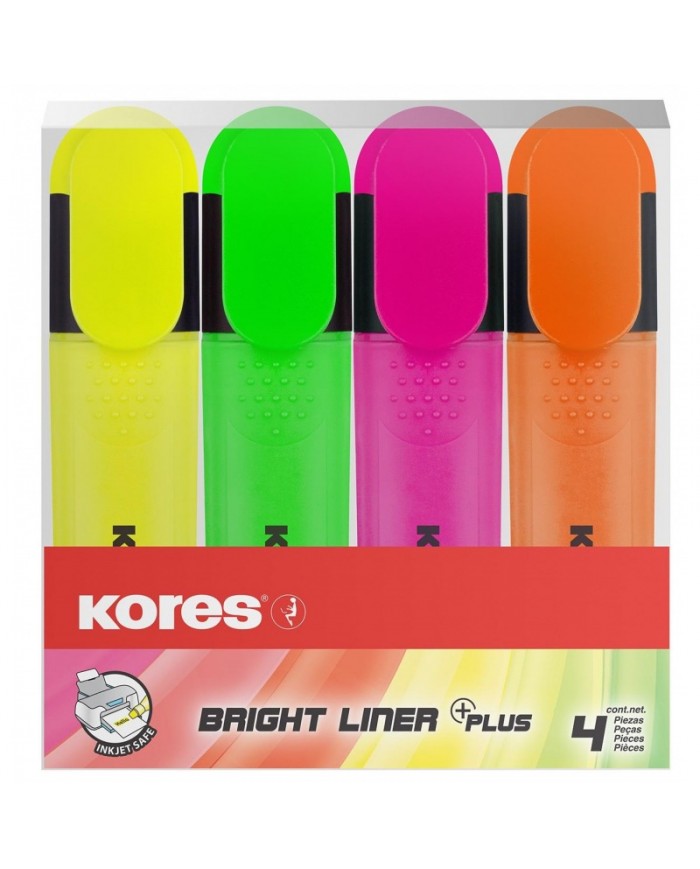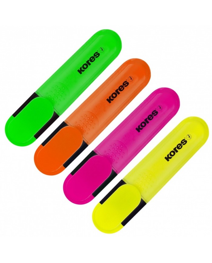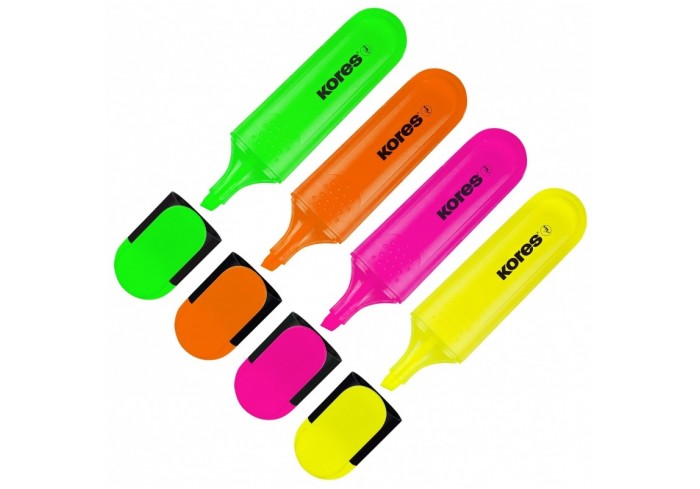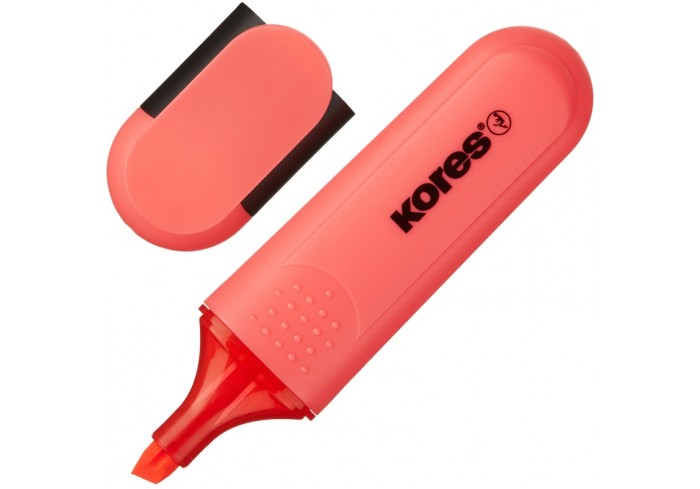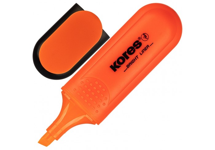 Текстовыделитель Kores со скошенным наконечником. Предназначен для выделения текста на различных типах бумаги. Позволяет проводить линии толщиной от 0..