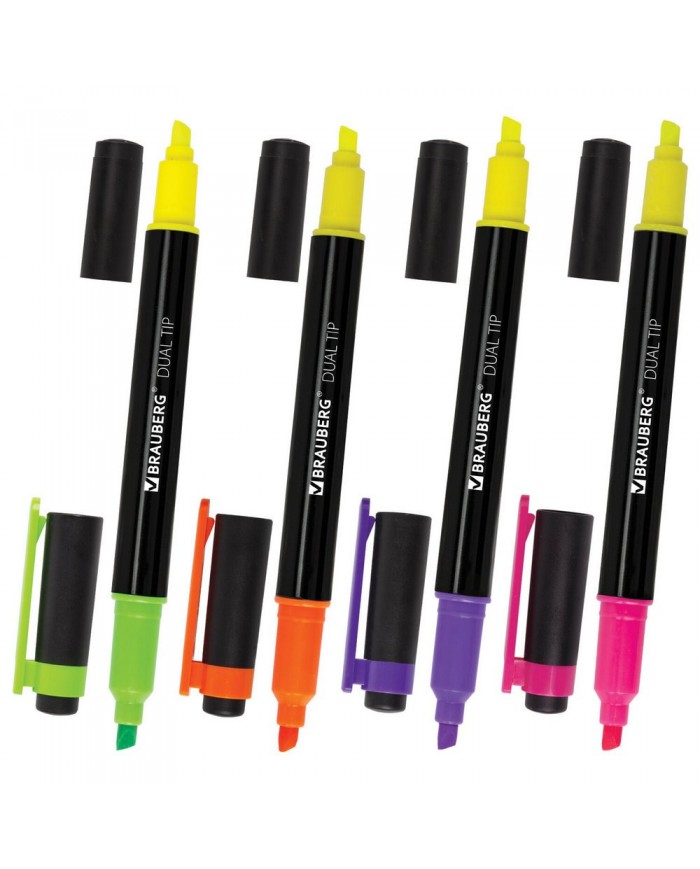 В наборе 4 двусторонних текстовыделителя неоновых цветов: желтый/зеленый, желтый/фиолетовый, желтый/розовый, желтый/оранжевый. Круглая форма корпуса д..