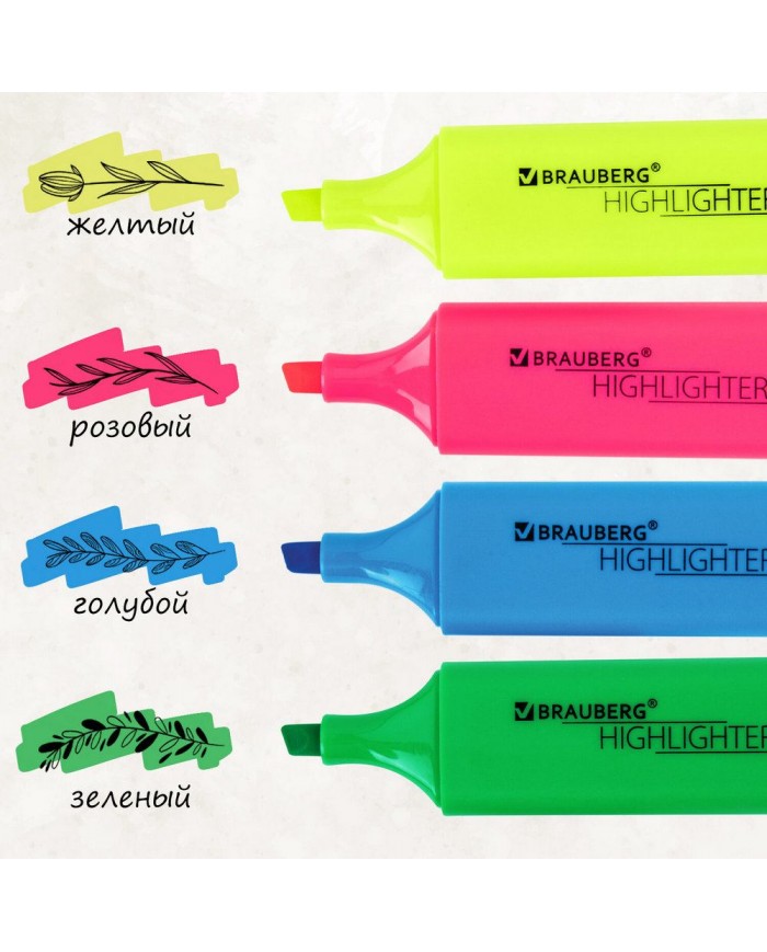 4 цвета в наборе: желтый, оранжевый, розовый и зеленый. Текстовыделители имеют плоскую форму корпуса, диаметр которого 25 мм. Скошенный наконечник име..
