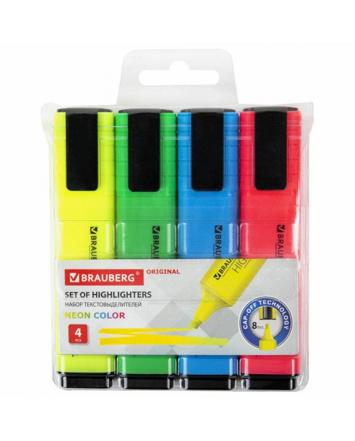 4 цвета в наборе: желтый, оранжевый, розовый и зеленый. Текстовыделители имеют плоскую форму корпуса, диаметр которого 25 мм. Скошенный наконечник имеет толщину линии письма от 1 до 5 мм, что обеспечивает удобство при работе с текстом, напечатанным мелким шрифтом, или таблицами. Чернила с неоновым эффектом обеспечивают неповторимую яркость выделения текста. Благодаря особой водной основе чернил текстовыделители не высыхают без колпачка в течение 8 часов. Текстовыделители обладают экономным расходом чернил, при этом длина линии письма достигает 300 метров. Чернила быстро впитываются и тем самым предотвращают размазывание в процессе использования. Светоустойчивые чернила не выцветают даже на открытом солнце. Цвет корпуса и колпачка соответствует цвету чернил.