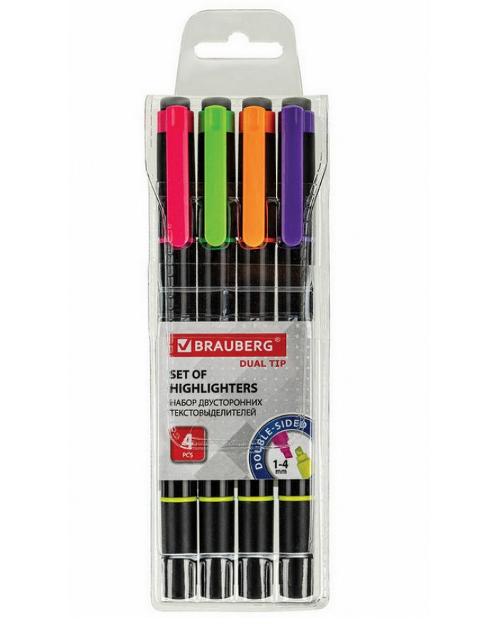 Набор текстовыделителей двусторонних BRAUBERG DUAL TIP 4 шт., АССОРТИ, линия 1-4 мм,