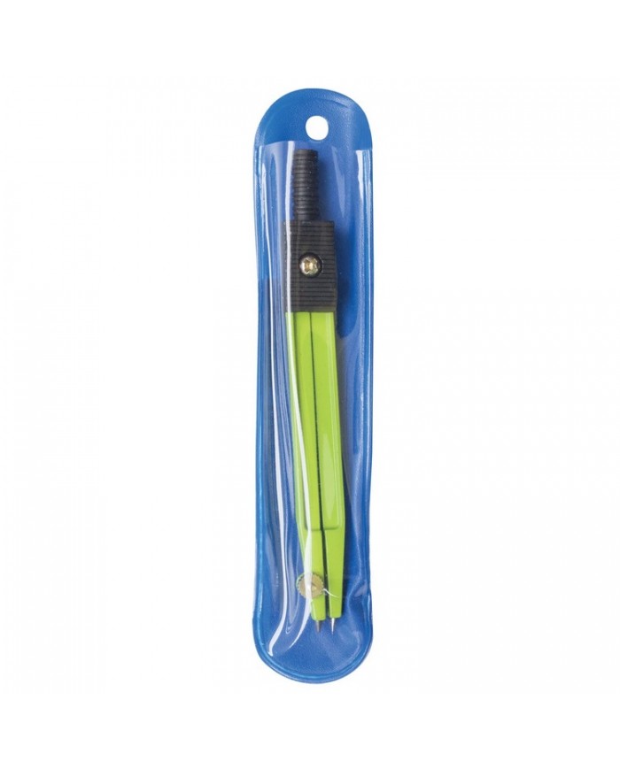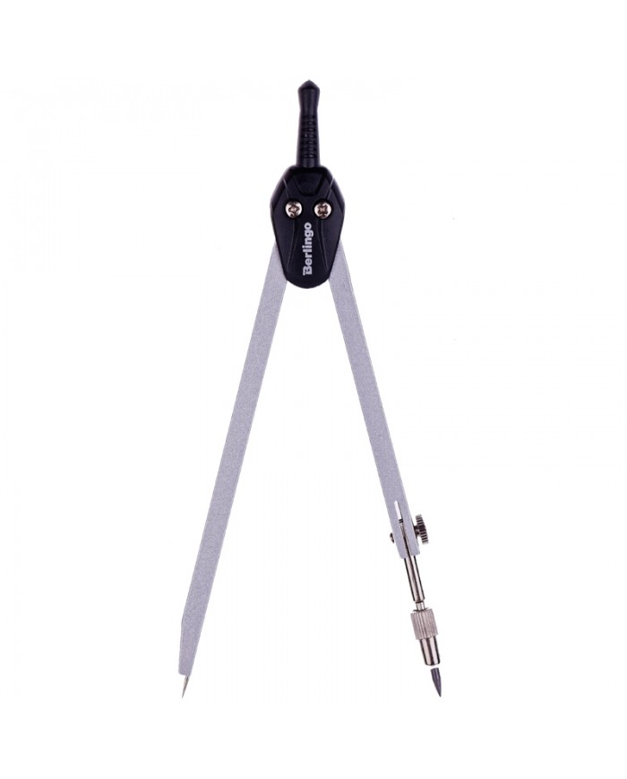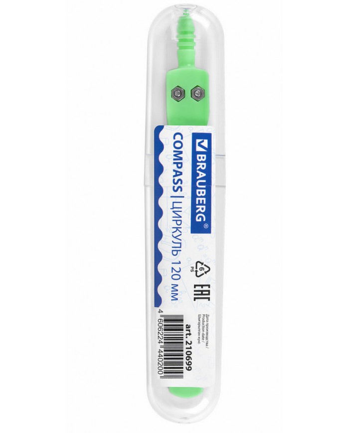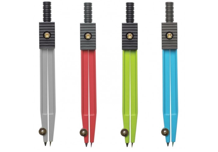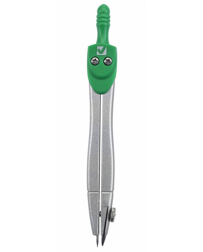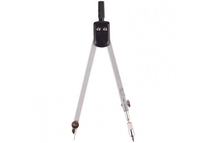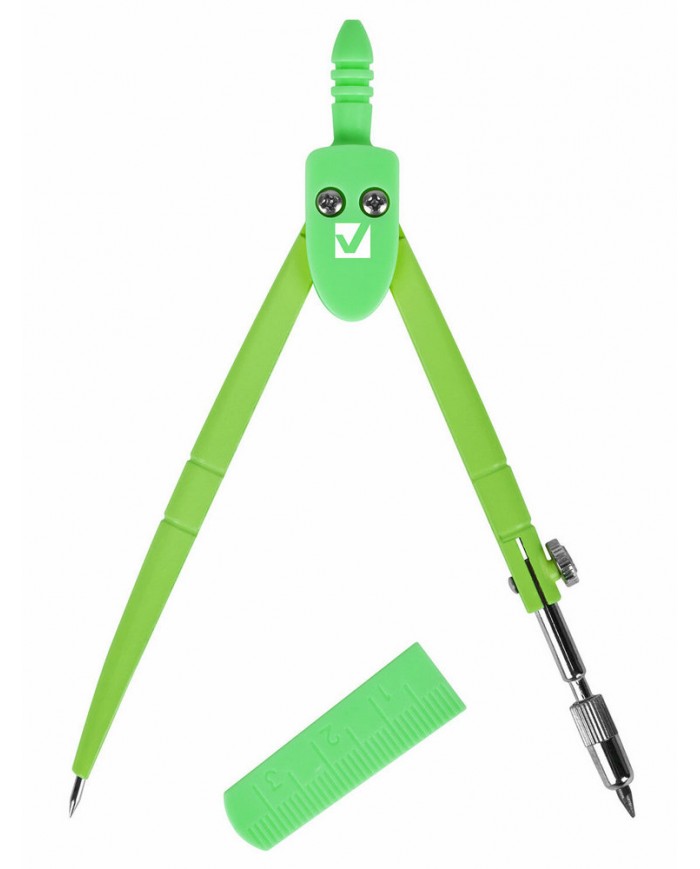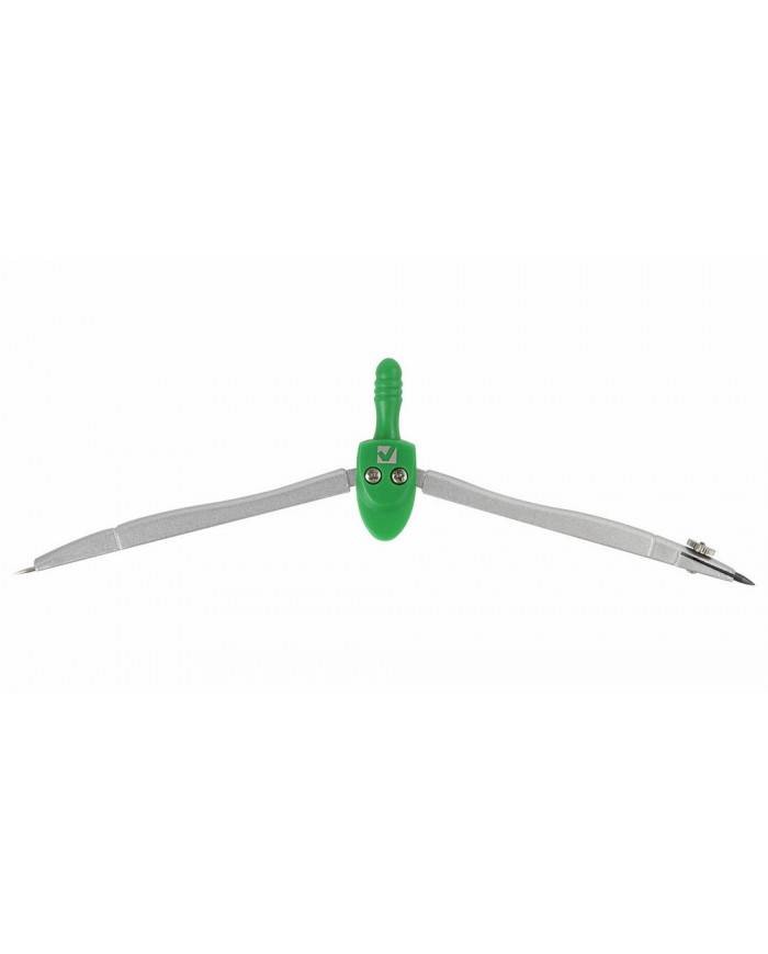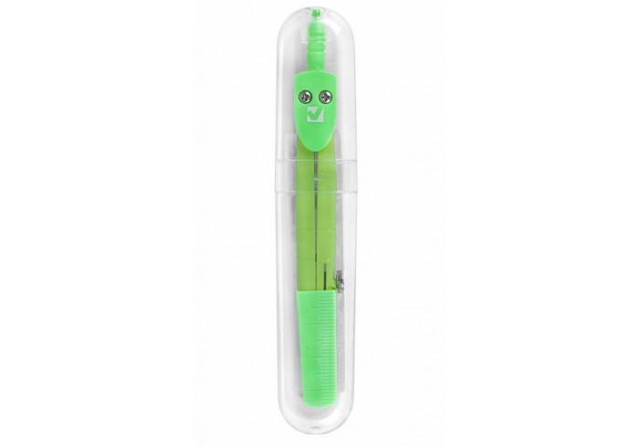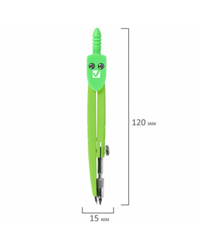 Инструмент длиной 120 мм имеет несгибаемые штанги и подстраиваемый грифель. Циркуль пастельно-зеленого цвета, изготовлен из металла, имеет пластиковый..
