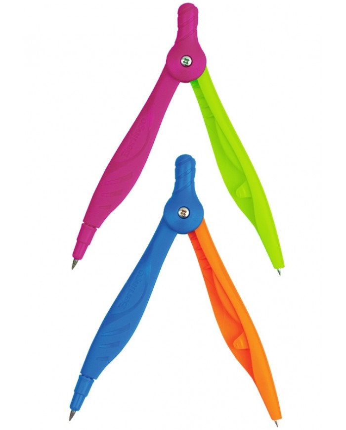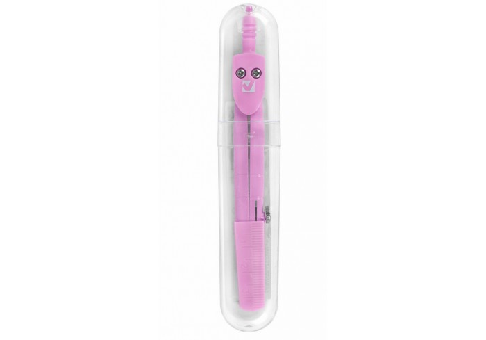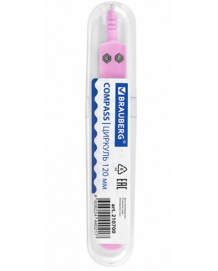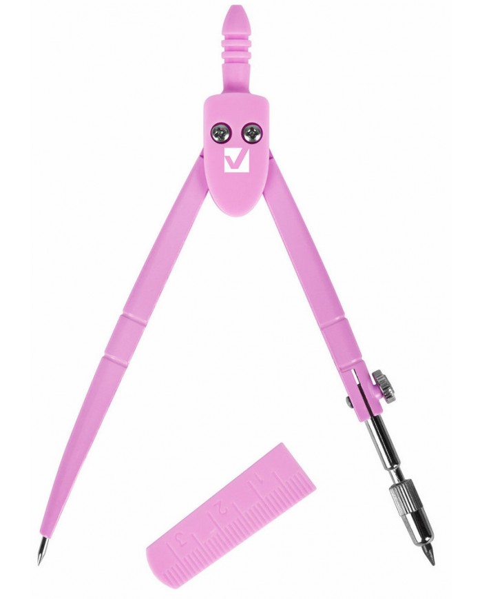 Инструмент длиной 120 мм имеет несгибаемые штанги и подстраиваемый грифель. Циркуль пастельно-розового цвета, изготовлен из металла, имеет пластиковый..