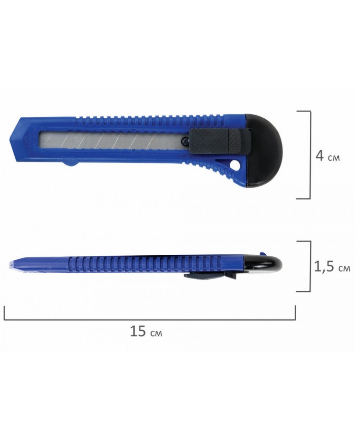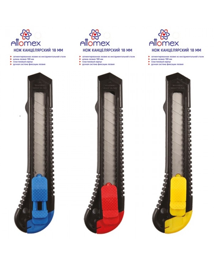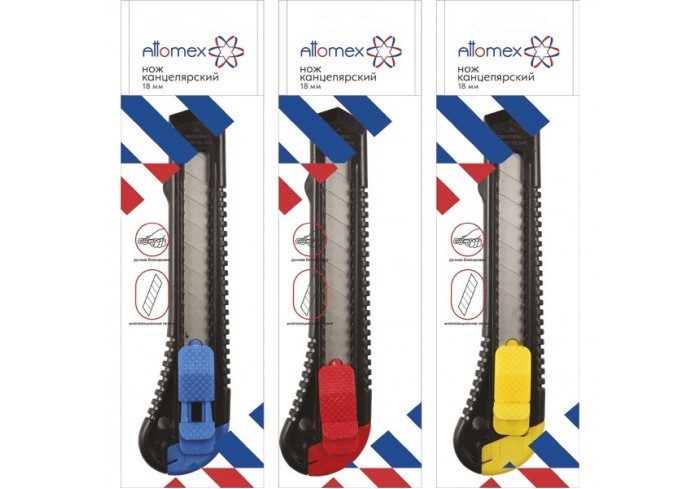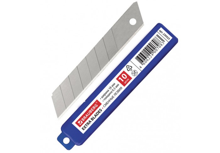 Острые лезвия шириной 18 мм из высокопрочной стали в надежном пластиковом корпусе со специальной защелкой. Защелка позволяет фиксировать лезвие в нужн..