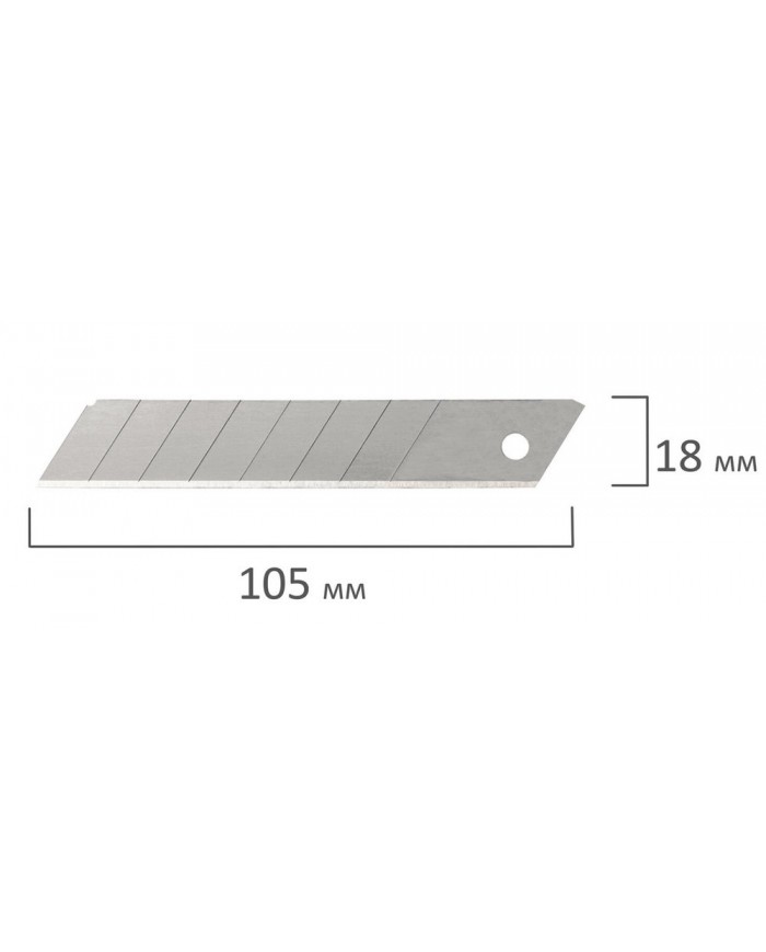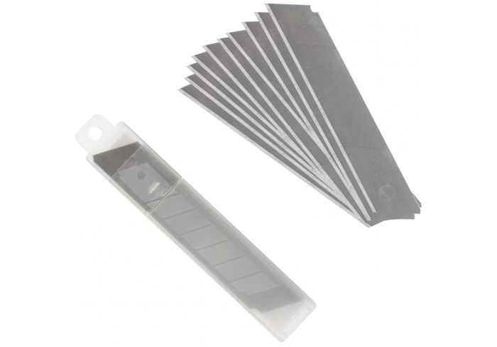 Изготовлены из углеродистой стали и имеют форму параллелограмма. Ширина лезвий - 18 мм, толщина - 0,5 мм. 10 штук в комплекте. Поставляются в пластико..