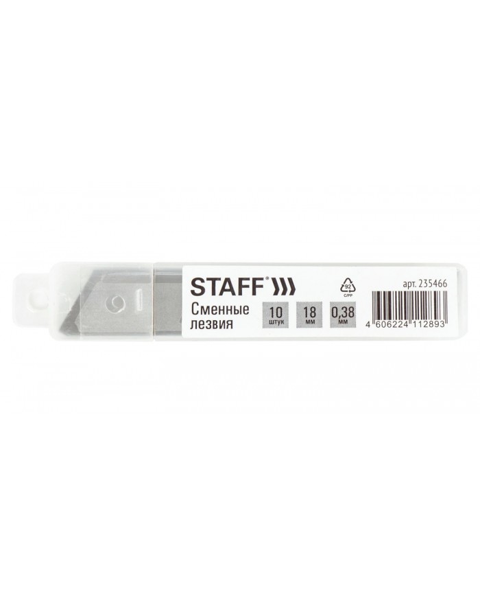 Изготовлены из углеродистой стали и имеют форму параллелограмма. Ширина лезвий - 18 мм, толщина - 0,38 мм. 10 штук в комплекте. Поставляются в пластик..