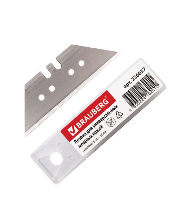 Лезвия для универсальных мощных ножей, 18 мм, BRAUBERG, КОМПЛЕКТ 5 ШТ., форма-трапеция, в пластиково