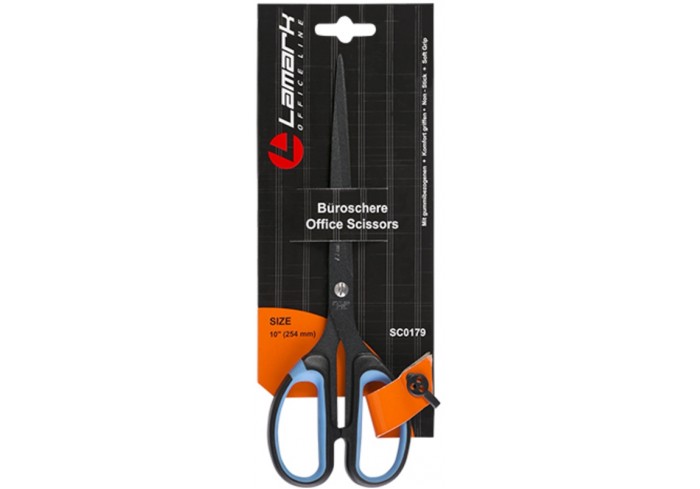 Ножницы канцелярские Lamark из нержавеющей стали с черным покрытием лезвий Non Stick. Эргономичные пластиковые ручки с удобным захватом с синими резин..