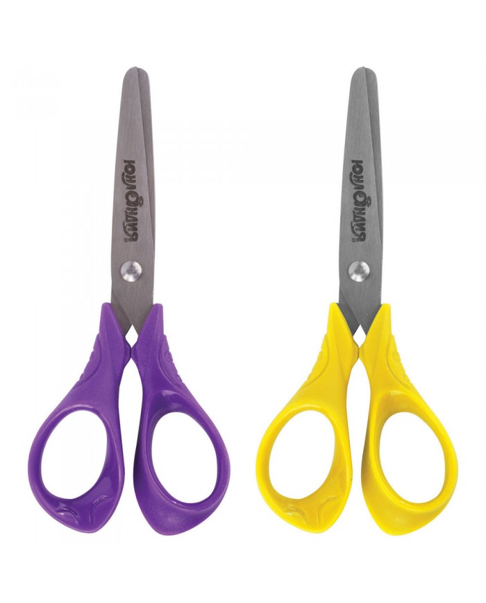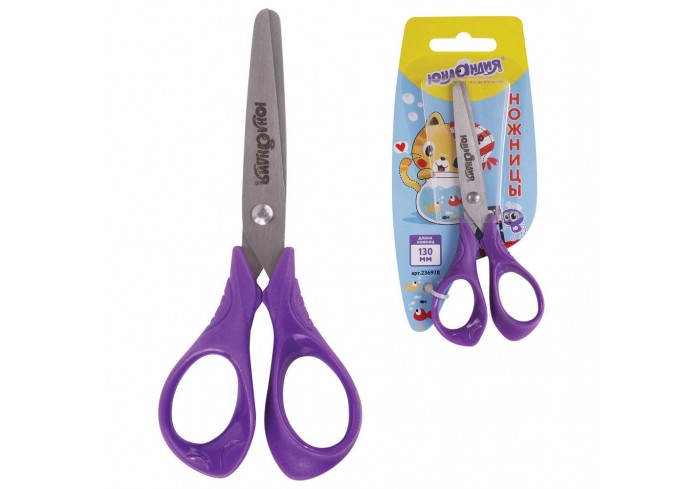 Ножницы ЮНЛАНДИЯ с симметричными ручками имеют удобные резиновые вставки желто-фиолетового цвета, которые не позволяют пальцам скользить во время испо..