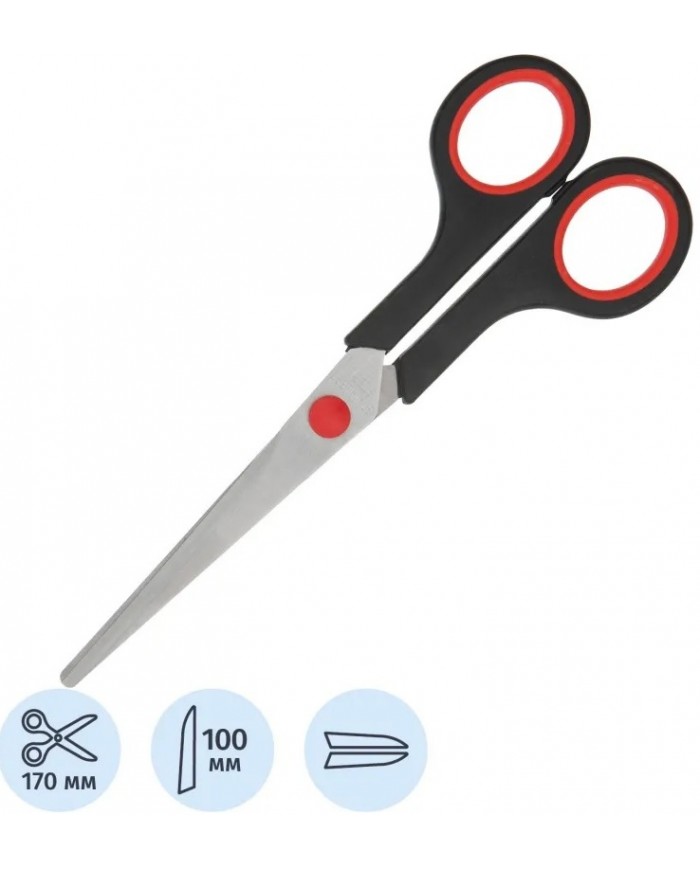 Ножницы универсальные Выбор есть 170 мм пластиковые ручки с резиновыми вставками красного и черного цвета. Универсальные ножницы Выбор есть - это практичный инструмент для решения множества бытовых задач. Особенности изделия: оптимальная длина 170 миллиметров - удобны для большинства видов работ. Универсальность: подходят для резки бумаги, картона, ткани, нитей и других материалов. Прочные лезвия изготовлены из нержавеющей стали, что обеспечивает долговечность и стойкость к коррозии. Двухсторонняя заточка обеспечивает аккуратный и ровный рез. Безопасность: тупоконечные лезвия снижают риск травмирования. Пластиковые ручки красного и черного цветов обеспечивают комфортный хват. Ножницы Выбор есть - надженый помощник дома и в офисе!