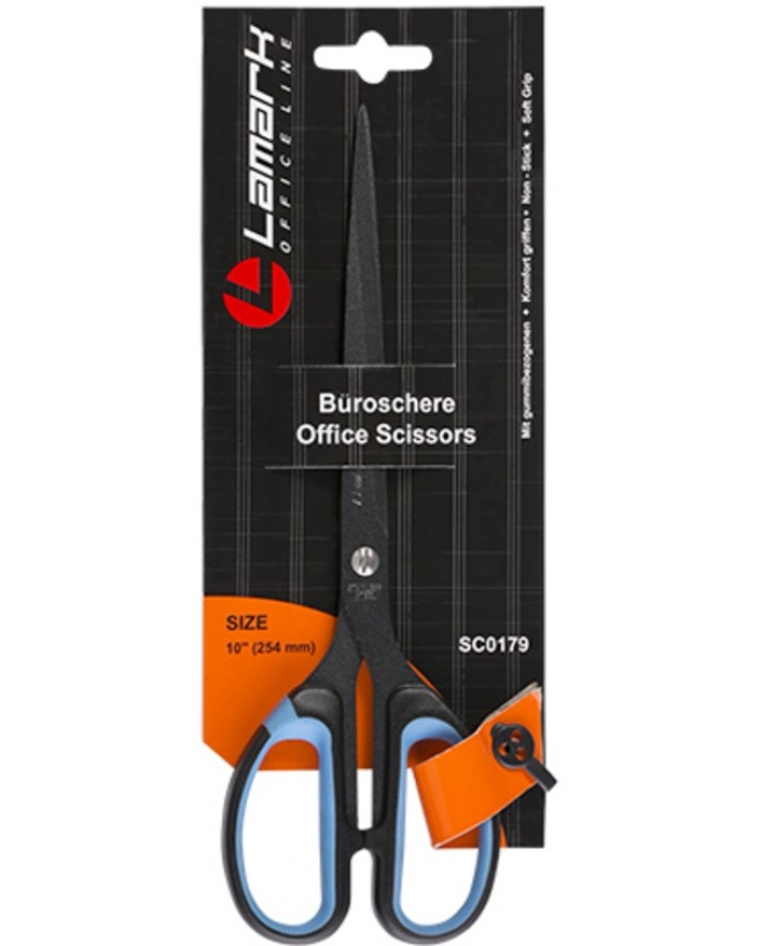 Ножницы канцелярские Lamark из нержавеющей стали с черным покрытием лезвий Non Stick. Эргономичные пластиковые ручки с удобным захватом с синими резиновыми вставками обеспечивают комфортную работу с материалами разной плотности. Размер ножниц 25,4 см. Поставляются в блистере с ерослотом.