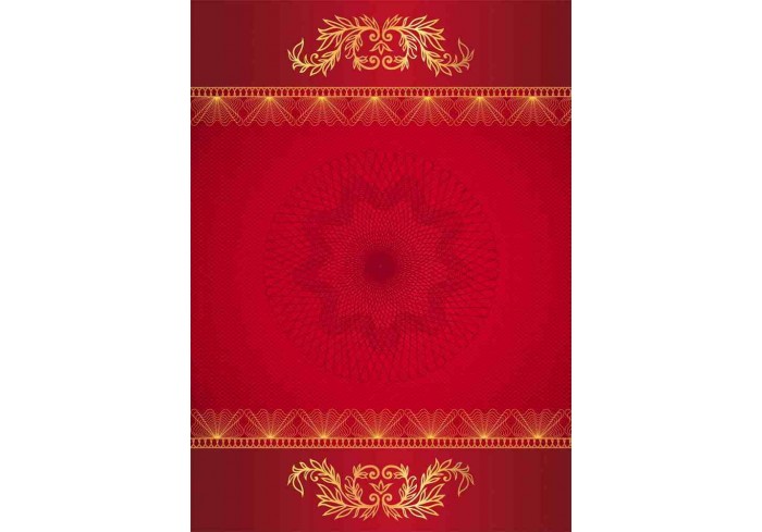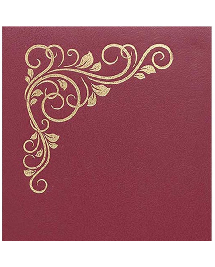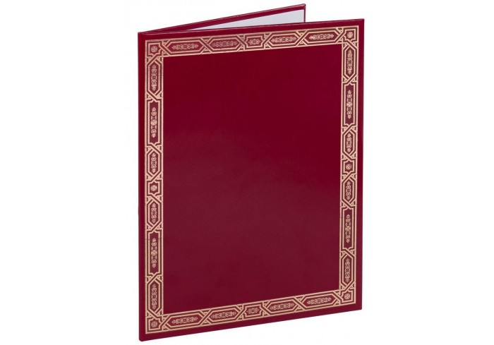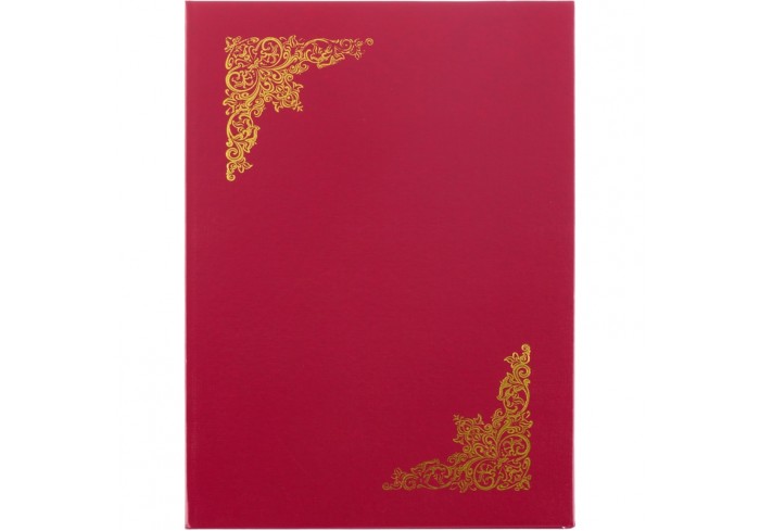 Адресная папка формата А4 изготовлена из бумвинила (слой ПВХ на бумажной основе), цвета бордо. На обложку методом тиснения золотой фольгой нанесен орн..