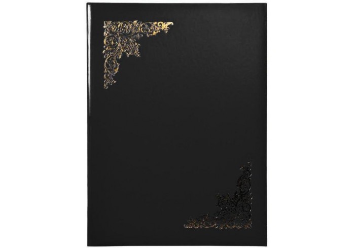 Адресная папка формата А4 изготовлена из бумвинила черного цвета (слой ПВХ на бумажной основе). На обложку методом тиснения золотой фольгой нанесен ор..