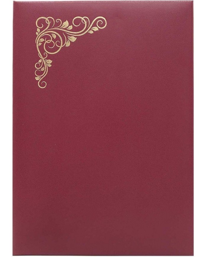 Адресная папка формата А4 изготовлена из бумвинила (слой ПВХ на бумажной основе), цвета бордо. На обложку методом тиснения золотой фольгой нанесен орнамент-виньетка. Внутренняя отделка - белая бумага. Внутри есть фиксирующая ленточка для бумаг. Адресная папка подходит для поздравлений. В упаковке 5 штук.