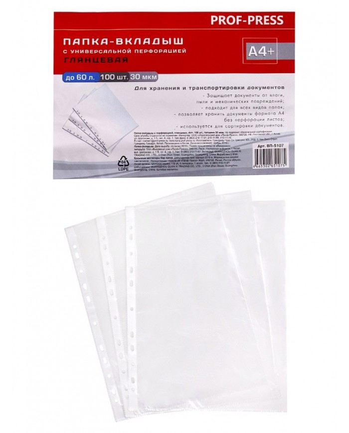 Папка-вкладыш с перфорацией, А4+. Глянцевая, плотность 30 мкм, 100 штук. Файлы предназначены для хранения и транспортировки документов. Защищают документы от влаги, пыли и механических повреждений. Подходят для всех видов папок. Используются для сортировки документов.