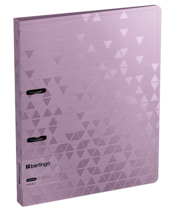 Папка на 2 кольцах Berlingo серии Metallic формата А4 (310*250*24 мм) изготовлена из плотного пластика толщиной 1 мм. Вместимость папки – 150 листов, ширина корешка – 24 мм. Кольцевой механизм с 2 кольцами диаметром 20 мм надежно держит перфорированные документы и документы, помещенные в файлы-вкладыши. Специальная D форма колец помогает удобно и ровно хранить документы, которые могут быть выровнены по левому краю, благодаря боковой вертикальной стенке кольца. Диаметр колец – 20 мм. Специальные формовые отверстия в обложке служат для надёжного защелкивания папки в сложенном виде, предотвращают случайное открытие обложки и замятие документов внутри при хранении и транспортировке. Изготовлена из высококачественного полипропилена с матовой текстурой поверхности «рельефные треугольники», на которой не видно отпечатков пальцев и мелких царапин. Предназначена для хранения документов. На внутренней стороне обложки оснащена плотным прозрачным карманом для удобного хранения мелочей: ручки, заметок, визиток, дисков, флешек и др. Упакована в индивидуальный прозрачный пакет по форме.