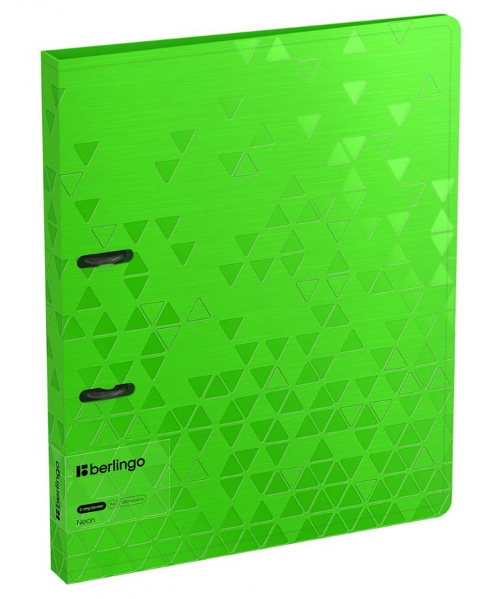 Папка на 2 кольцах Berlingo серии Neon формата А4 (310*250*24 мм) изготовлена из плотного пластика толщиной 1 мм. Вместимость папки – 150 листов, ширина корешка – 24 мм. Кольцевой механизм с 2 кольцами диаметром 20 мм надежно держит перфорированные документы и документы, помещенные в файлы-вкладыши. Специальная D форма колец помогает удобно и ровно хранить документы, которые могут быть выровнены по левому краю, благодаря боковой вертикальной стенке кольца. Диаметр колец – 20 мм. Специальные формовые отверстия в обложке служат для надёжного защелкивания папки в сложенном виде, предотвращают случайное открытие обложки и замятие документов внутри при хранении и транспортировке. Изготовлена из высококачественного полипропилена с матовой текстурой поверхности «рельефные треугольники», на которой не видно отпечатков пальцев и мелких царапин. Предназначена для хранения документов. На внутренней стороне обложки оснащена плотным прозрачным карманом для удобного хранения мелочей: ручки, заметок, визиток, дисков, флешек и др. Упакована в индивидуальный прозрачный пакет по форме.