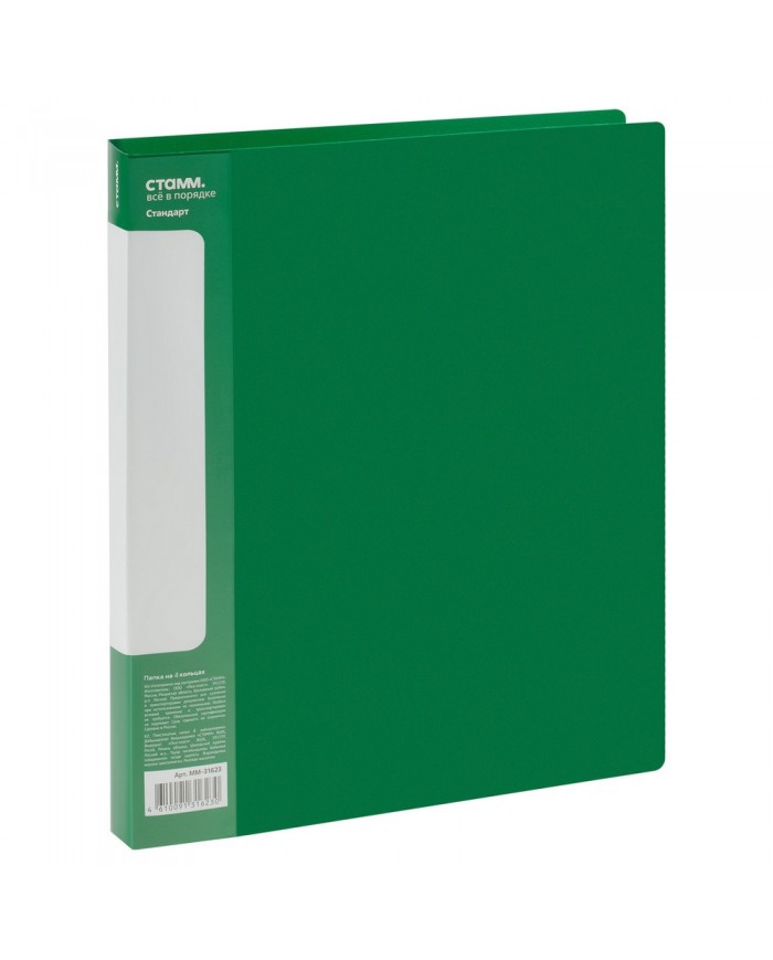 Папка на 4 кольцах «СТАММ» серии «Стандарт» предназначена для хранения перфорированных документов формата А4. Цвет папки — зелёный. Изготовлена из полипропилена толщиной 700 мкм с текстурой «песок». Размер изделия составляет 250*310 мм.