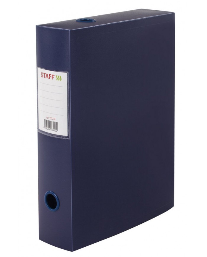 Вмещает до 750 листов формата А4. Изготовлен из прочного пластика синего цвета толщиной 0.7 мм. В закрытом виде фиксируется с помощью металлической кнопки. Размер - 330х245х70 мм. Сменная этикетка в кармане на корешке. Поставляется в разобранном виде.