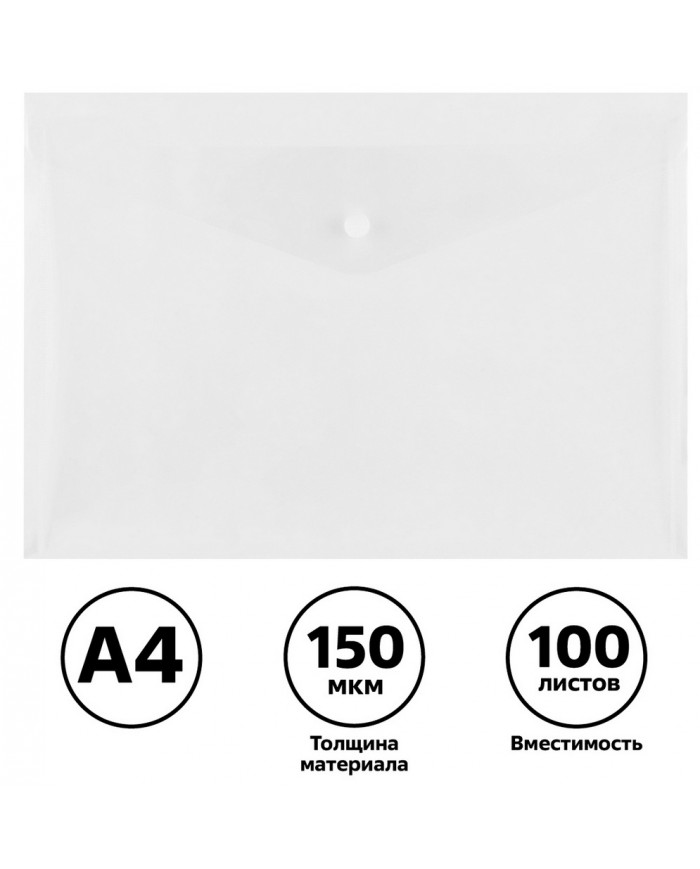 Папка-конверт на кнопке «СТАММ» формата А4 надёжно защищает документы от влаги и пыли. Горизонтальная папка вмещает до 100 листов. Цвет папки – прозрачный бесцветный. Папка изготовлена из качественного полипропилена плотностью 150 мкм с глянцевой текстурой. Размер папки составляет 330*235 мм. Изделие плотно закрывается клапаном с кнопкой.